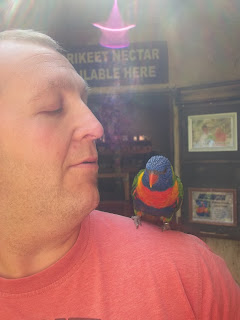 | Mark and a cute bird in Cango wildlife ranch (before it took a dump on my shoulder and flow away) |